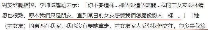 李坤城尷尬回復:你不要這樣……那個跟這個無關,我前女友也跟林靖恩很熟,原本我們只是朋友,直到某日前女友覺得我和林靖恩才更像是戀人一樣……