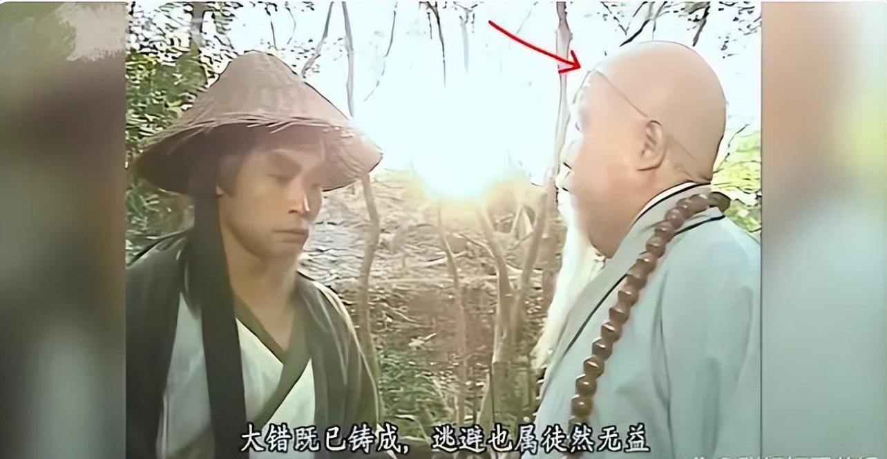 除此之外在這部《天龍八部》中還有很多穿幫鏡頭,像揭露喬峰身世那天,智光大師的頭皮有點按捺不住,很明顯就能看出智光大師的光頭是頭上帶著頭套的。
