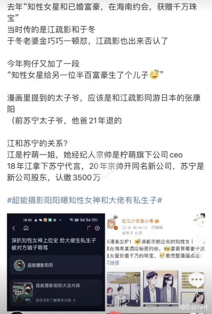 網友紛紛推測其中的當事人是江疏影、于冬、蘇寧的老總張近東,太子爺張康陽。