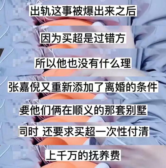 后來,買超被曝出軌,因為他屬于過錯方比較理虧,所以張嘉倪又重新添加了離婚條件,不僅要他們位于北京順義的那套別墅豪宅,同時還要買超一次性付清上千萬元的撫養費。