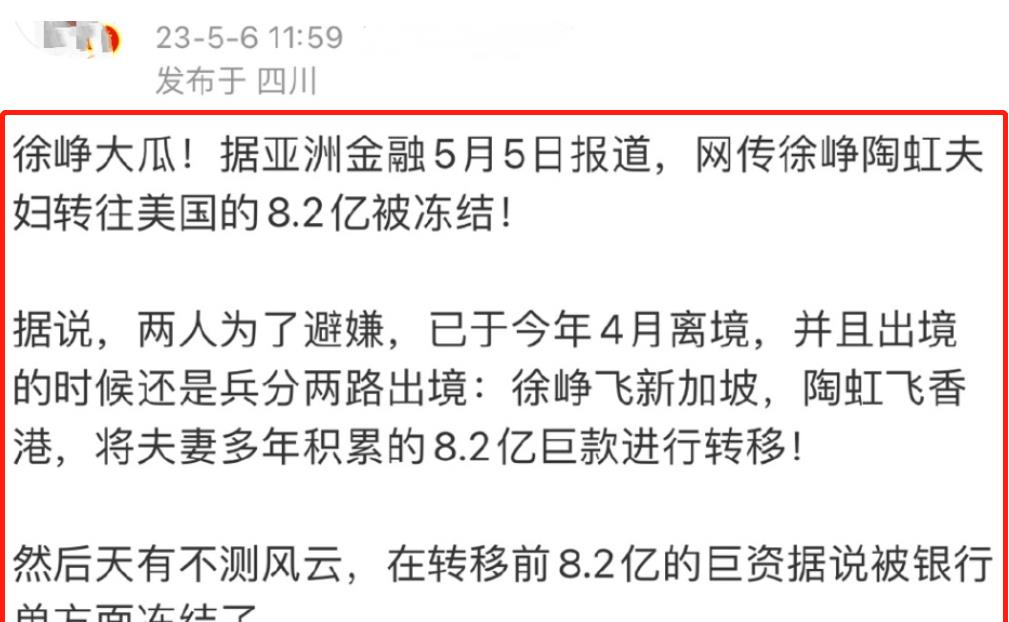 爆料者稱,徐崢和陶虹在今年4月份拿著8.2億離境,并進行資產轉移。