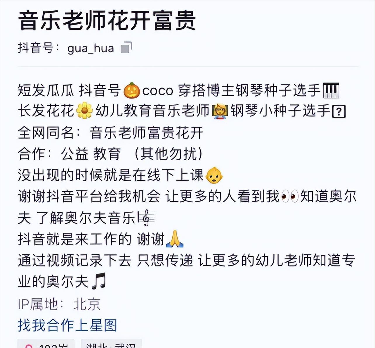 她視頻賬號的簡介中,稱自己的職業是是幼兒教育音樂老師。