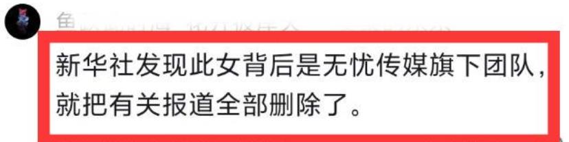 而有爆料稱,新華社在看到她背后是無憂傳媒的團隊后,已經刪除了相關報道。
