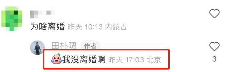 就在人們猜測兩人離婚的原因時,田樸珺在回復中否認了離婚傳言:“我沒離婚啊。”