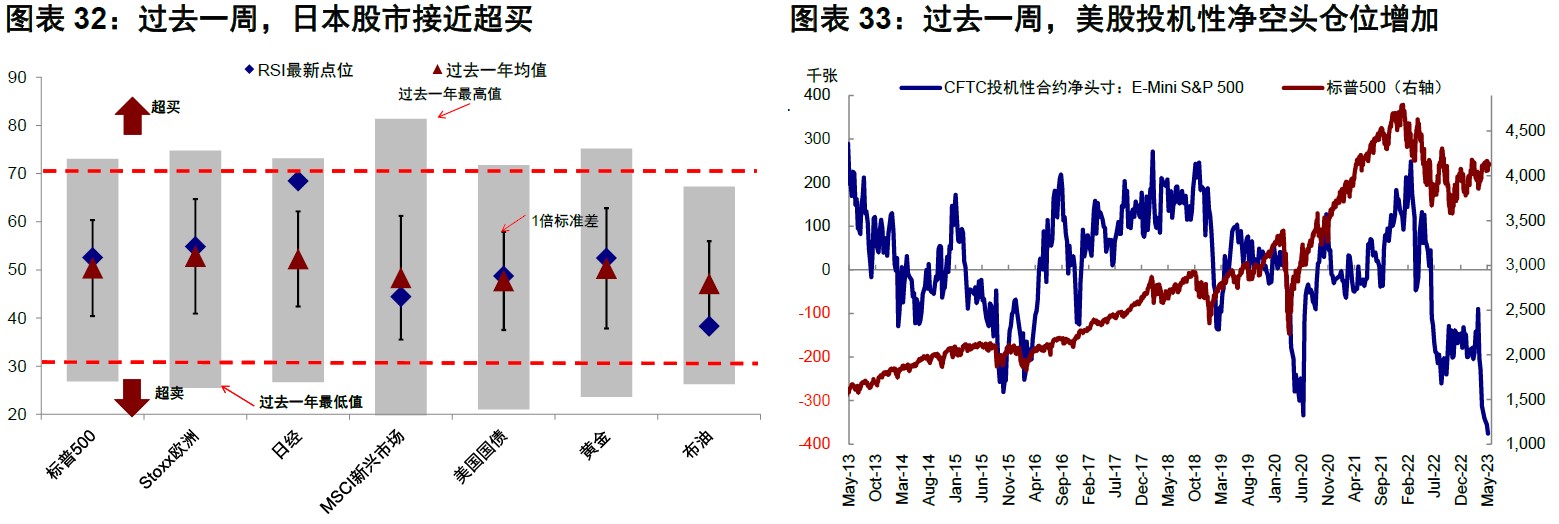 ?情緒倉位:日本股市接近超買、美股凈空頭倉位增加。過去一周,去除趨勢項后的美股看空/看多比例(10天平均)回落,日本股市接近超買。倉位方面,美股投機性凈空頭倉位增加,新興市場投機性凈多頭倉位增加,美元投機性凈多頭倉位減少,黃金投機性凈多頭倉位增加。
