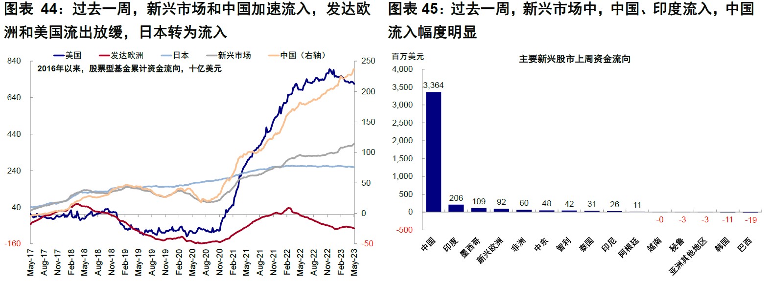 ?資金流向:股票型基金及日本轉為流入。過去一周,債券型基金及貨幣市場基金流入放緩,股票型基金轉為流入。分市場看,新興市場和中國加速流入,發達歐洲和美國流出放緩,日本轉為流入。近期新興與美股之間資金強弱關系轉向新興。