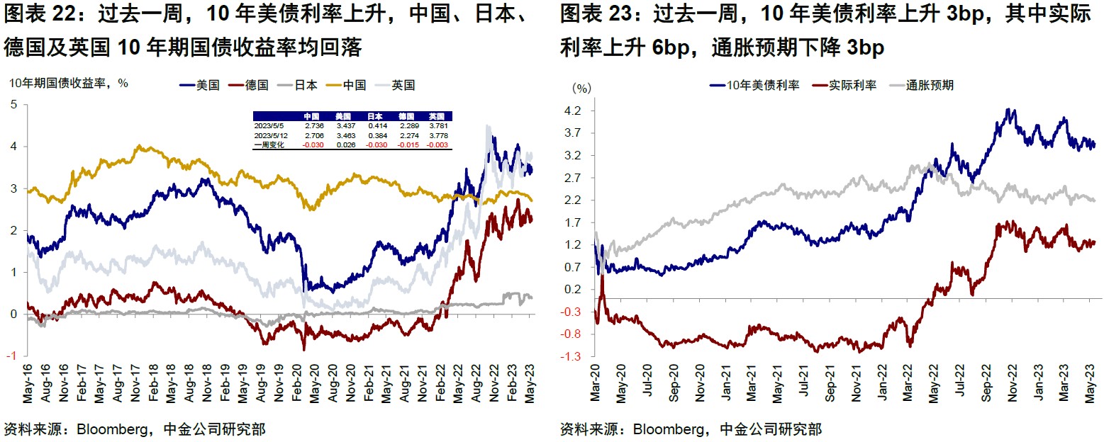 ?資產表現:債>股>大宗;美元走強,成長領先。本周美國財長耶倫再度預警債務上限問題[2],眾議院議長麥卡錫也表示兩黨談判并未有實質性進展[3]進一步引發市場違約擔憂。紐約聯儲主席威廉姆斯重申年內沒有降息的理由[4],但周中美國通脹數據出爐顯示4月CPI和PPI均低于市場預期,9月降息的市場預期仍存,美債利率回落,成長風格領先。臨近周末美聯儲官員再度放鷹,美聯儲理事巴爾金表示通脹依然較高、加息可能尚未結束[5],5月密歇根大學顯示市場5年期通脹預期指數達3.2%創2011年以來新高,緊縮預期回升背景下美股再度回調。