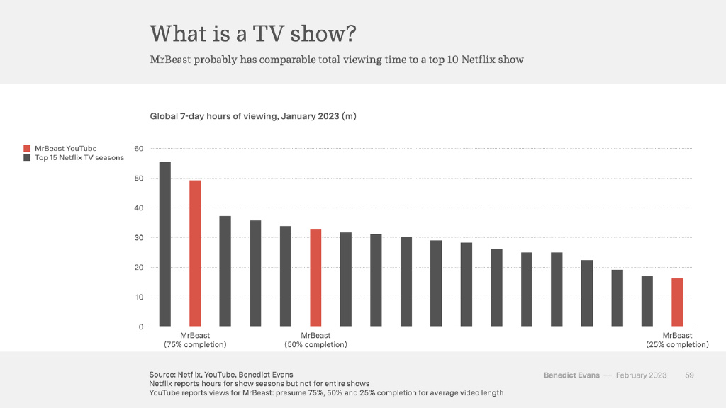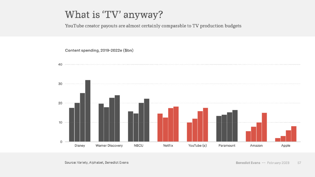無(wú)論是從網(wǎng)絡(luò)規(guī)模還是從內(nèi)容類型而言,YouTube 對(duì)“電視”的改變可能都比 Netflix 大得多。其平臺(tái)上的內(nèi)容是“視頻”,而且用戶在平臺(tái)上的“時(shí)間花費(fèi)”也很重要。更重要的是,它的競(jìng)爭(zhēng)對(duì)手不僅僅是 Netflix 和電視,而且還包括 Instagram 和 TikTok。(令我感到困惑的是,大家都更加關(guān)注 Instagram 和 TikTok 之間的競(jìng)爭(zhēng)關(guān)系,但事實(shí)上,YouTube 也在這層競(jìng)爭(zhēng)關(guān)系之中。)另外,YouTube 不需要購(gòu)買電視節(jié)目,也不需要花錢獲取用戶,它反而會(huì)向平臺(tái)創(chuàng)作者支付營(yíng)收分成。