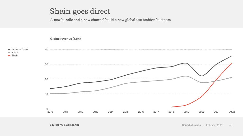 對(duì)于 Shein 和 Netflix 來(lái)說(shuō),互聯(lián)網(wǎng)是一個(gè)運(yùn)作方式全然不同的新渠道。如果你不需要開(kāi)設(shè)數(shù)以千計(jì)的實(shí)體商店,那你就可能以更快的速度更新產(chǎn)品內(nèi)容和觸達(dá)客戶。因此,Shein 現(xiàn)在要比 H&M 大得多,甚至還有望超過(guò) Zara 母公司 Inditex 集團(tuán)。但歸根結(jié)底,Shein 的核心重點(diǎn)仍然是服裝,其所有問(wèn)題都是快時(shí)尚問(wèn)題。
