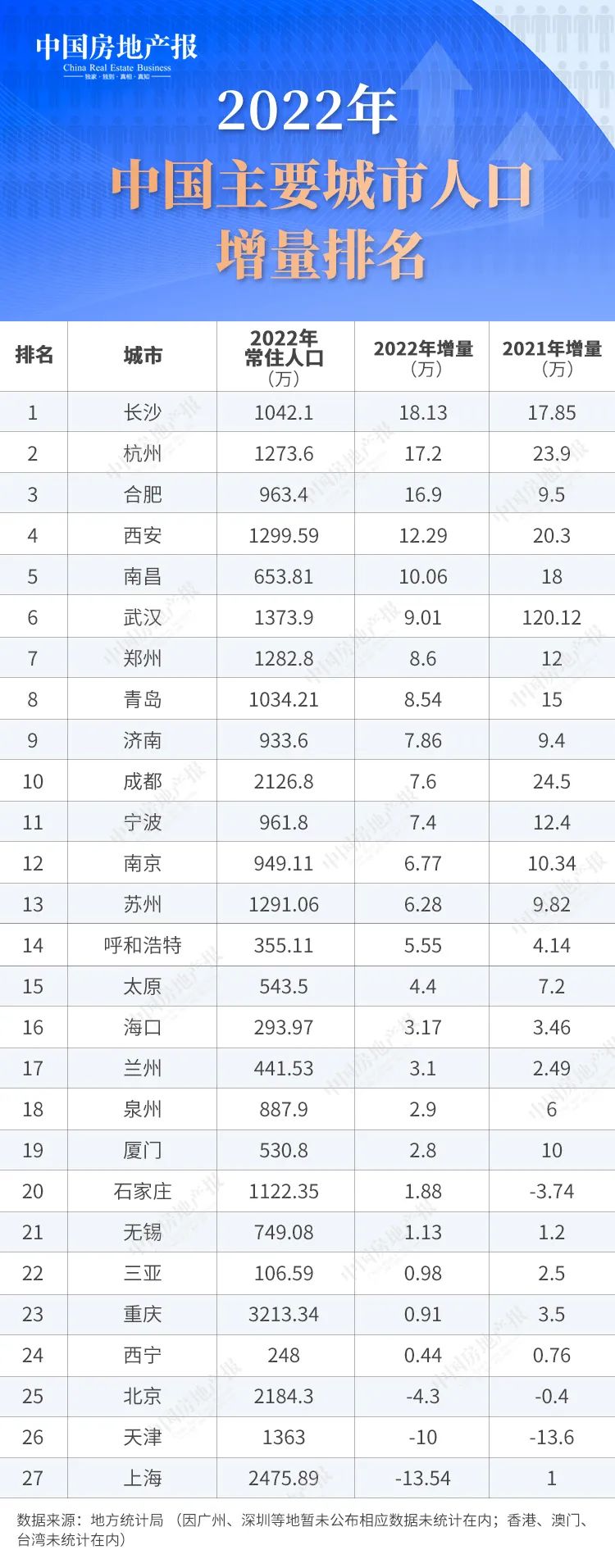 去年一年長(zhǎng)沙人口增量為18.13萬(wàn),不僅比2021年17.85萬(wàn)的人口增量要多,且還一舉超過(guò)杭州、合肥、武漢等地,在27個(gè)城市排名中位列第一。