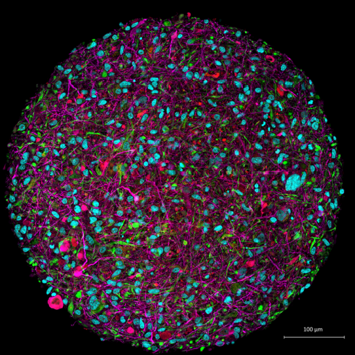 實驗室培養的大腦類器官的放大圖像,具有針對不同細胞類型的熒光標記。(粉紅色—神經元;紅色—少突膠質細胞;綠色—星形膠質細胞;藍色—所有細胞核)。圖片來源:托馬斯·哈通/約翰斯·霍普金斯大學