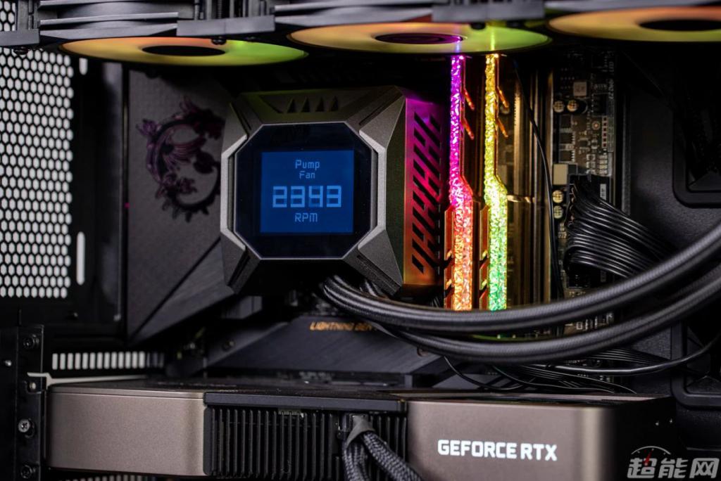 這款產品最能讓人記住的就是體積巨大的水冷頭,比一般的產品都要大。頂部有一個 2.4 英寸的液晶顯示屏,里面還有一個嵌入式冷頭風扇,加上各種線材的集中,顯得整個結構非常繁瑣。