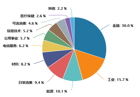 行業分布看,國有企業主要分布在關系國家安全和經濟命脈的重要行業,產業分布偏中上游。以中證國企指數來看,工業、材料等行業上市公司數量占上市國企總數的43%以上(圖3),金融、工業行業市值占比靠前(圖4)。