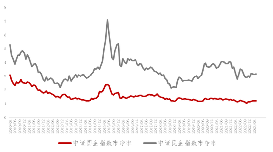 圖1、中證國企指數估值(紅)長期低于中證民企指數估值(灰)