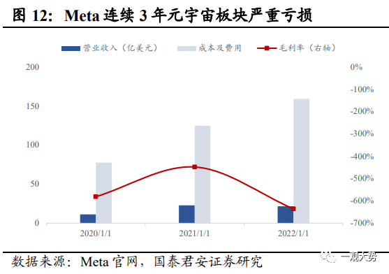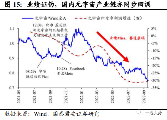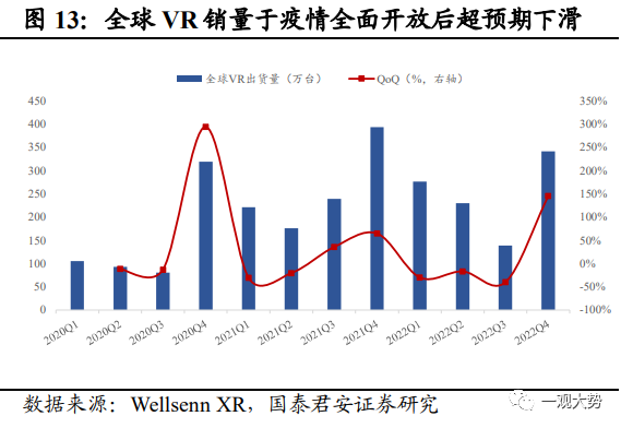 2021年元宇宙主題行情:始于巨頭入局和VR設備出貨超預期,止于業績表現的證偽。2021年10月,以Facebook押注元宇宙為契機,市場掀起元宇宙主題行情,短時間內國內外多家互聯網科技巨頭相繼宣布入局。國外方面,微軟推出 Mesh for Team,切入元宇宙辦公賽道,google計劃重組 Google Labs,專注于研發包括 AR/VR 等具備長期發展潛力的設備;國內方面,字節相繼投資光舟半導體、眾趣科技、夢途科技,阿里巴巴達摩院宣布增設 XR 實驗室。與此同時,疫情期間電子娛樂需求激增,VR頭顯設備全球出貨量超市場預期,21年Q3-Q4全球出貨量增速超60%,連續兩個季度保持穩定高速增長態勢。巨頭的紛紛入局以及設備端銷售超預期之下,元宇宙行情開啟。而后續缺乏業績驗證也導致了行情僅停留在概念階段,主題行情持續時間較短,觸頂后熱潮隨即退卻。其一,2022年2月Meta和Roblox 相繼披露年報,其中Meta元宇宙業務板塊連續兩年虧損嚴重,業績表現不及預期挫及市場信心,引發投資者對元宇宙前景的擔憂,年報公布當日,二者股價下跌超20%。其二,2022年疫情全面放開后,“宅經濟”概念退潮,全球VR設備出貨量大幅下滑超預期。整體來看,概念超前、缺乏現象級硬件支撐、生態不成熟等因素是行情無法向業績驗證過渡的重要原因。
