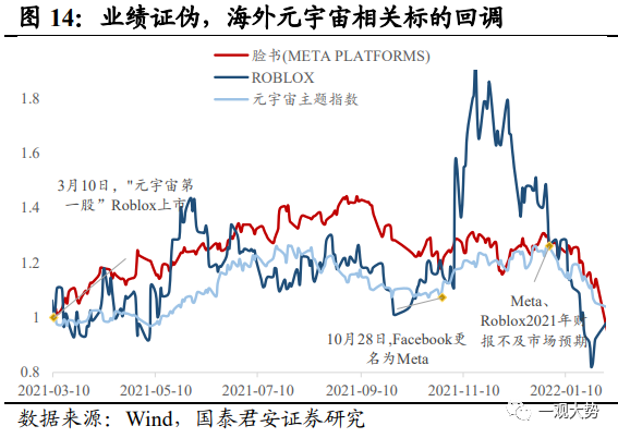 正如前文提到,蘋果MR的突破并不僅在于產品本身,更是提供了虛實交互的硬件端入口,成為了元宇宙的關鍵一環。MR的交互創新激發對下游內容端新的探索,同時實時沉浸式交互體驗對上游基礎設施低延時網絡傳輸、底層算力技術升級亦提出要求。這也意味著從投資機會角度,MR的出現和破局所帶來的并非僅是蘋果產業鏈的投資機會,亦將成為元宇宙乃至TMT行情的新催化。下一階段,MR行情將如何輪動?設備端的超預期將如何帶動整體元宇宙板塊的投資機會?2021年的元宇宙主題行情為我們提供了參考,可以發現1)行情的結束核心在于業績端的證偽;2)行情在下游應用、上游算力基礎設施和VR/AR板塊均有表現,下游應用端彈性高于上游算力基礎設施。