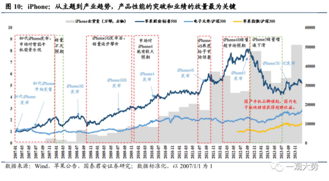 前文我們提到此次蘋果MR創新直擊痛點,是一個可能的從0-1的爆款產品,有望開啟頭顯設備的產業趨勢。歷史上,蘋果的iphone和特斯拉的model3都可以稱之為帶動智能手機和新能源汽車產業鏈的成功爆品。那么對于爆款產品的問世,究竟我們更應該關注哪些因素?什么才是決定行情演繹的關鍵呢?為此,我們考察iphone和model3產品和業績表現與相應產業鏈股價表現之間的關聯。
