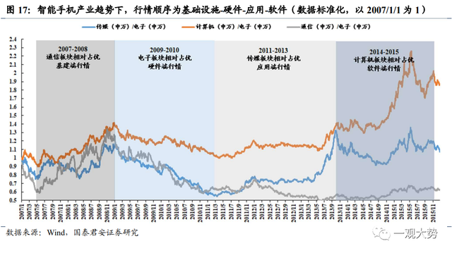 智能手機發展沿著3G建設→硬件迭代→應用爆發,行情順序同步表現為基礎設施端-硬件端-應用端-軟件端。2008年,3G等基礎設施建設快速完善,隨后iphone3G-iphone4-iphone4s等系列問世,A股蘋果供應鏈相關公司受益,此后2012年前后小米、華為榮耀等銷量大增,國產千元機時刻來臨,手機出貨量迅速增加,硬件端加速迭代,帶動相應消費電子板塊行情。而伴隨著硬件性能的成熟以及智能手機的加速滲透,下,微信、支付寶等爆款APP出現帶來內容端的持續爆發,手游、短視頻、社交、購物等內容應用迎來爆發式增長,此時傳媒和計算機板塊開始迎來超額收益。
