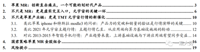 ?不只是蘋果產業鏈:更是TMT元宇宙行情的新催化。類比此前爆款產品蘋果iphone和特斯拉modle3的問世,產品力的突破和銷量的驗證是行情從主題走向真正產業趨勢的關鍵,當前市場對MR產品創新突破的預期帶來主題行情演繹,后續MR發布對產品力的驗證以及出貨能否超預期將是決定其能否形成產業趨勢的關鍵。但值得強調的是,無論是當下的主題行情還是后續可能的產業趨勢行情,MR并不僅是提供了自身供應鏈相關的投資機會,更是成為了整個TMT元宇宙板塊(下游基礎設施和上游內容應用等)行情的新催化。具體而言:1)主題行情階段:類比2021年巨頭入局和VR設備出貨超預期之下的元宇宙主題行情,預計本輪由MR引領的元宇宙行情有望自下游應用向上游算力和基礎設施板塊輪動,同時下游應用端彈性將有望高于上游板塊。2)產業趨勢引領階段:當前底層基礎設施建設已初步滿足MR硬件創新需要,同時手機內容端的繁榮已為MR內容創新提供范例,因此,相比于2013-2015年智能手機行情在基礎設施-硬件-軟件的逐步演繹,預計在MR產業趨勢浪潮中,上下游行情的演繹節奏有望更為同步。