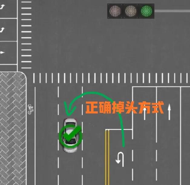 這種情況下掉頭,好多人懵懵懂懂,容易迷糊犯錯誤,通常情況下,一般我們總是認為:掉頭一定要過人行橫道的斑馬線,然后再去掉頭,如果你這樣想就錯誤啦!所有的紅綠燈路口掉頭都是要前提的,沒有固定的方式,或者說沒有一刀切的方式,更加不會有絕.對.的正確掉頭方式,不要想著一勞永逸。