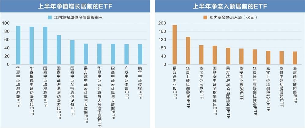 從單只基金來看,華夏中證動漫游戲ETF、華泰柏瑞中證動漫游戲ETF和國泰中證動漫游戲ETF上半年回報率居前,凈值增長率均為90%以上;多只追蹤云計算與大數據指數的ETF也表現優異,年內累計凈值漲幅均超45%。此外,4只追蹤納斯達克100指數的QDII(合格境內機構投資者)基金凈值增長率也進入前20名,凈值增長率均超40%。