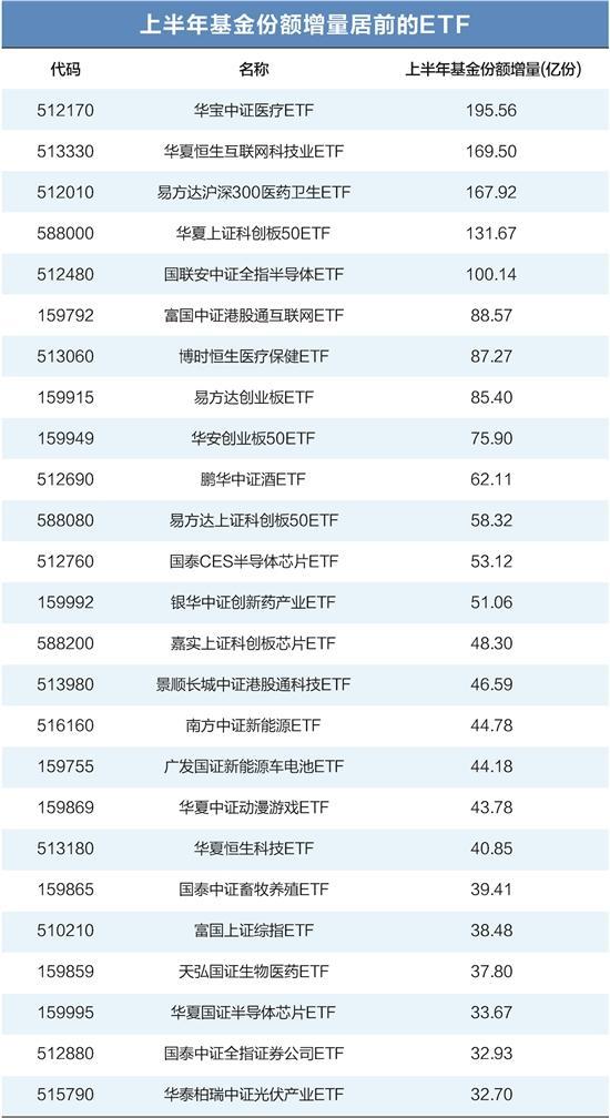 具體到單只基金,華寶中證醫療ETF、華夏恒生互聯網科技業ETF、易方達滬深300醫藥衛生ETF拿下份額增長前三名,份額依次增加195.56億份、169.5億份、167.92億份,3只ETF年內回報率均跌逾10%。