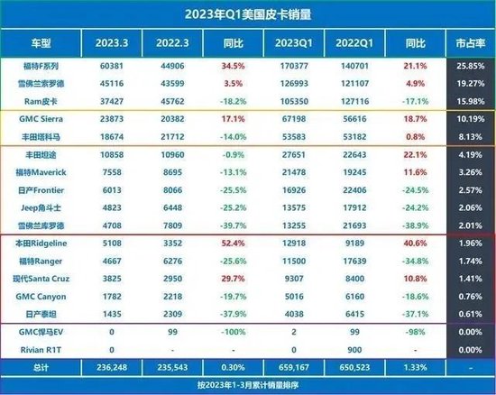 今年3月,美國(guó)市場(chǎng)銷售皮卡新車236248輛,相比2022年3月235543輛的成績(jī),僅同比上漲0.3%;1-3月累計(jì)銷售新車659167輛,較2022年同期上漲了1.33%。事實(shí)上,2020年以來(lái),美國(guó)皮卡銷量已經(jīng)連續(xù)三年同比下降,銷量較2019年跌去近10%。