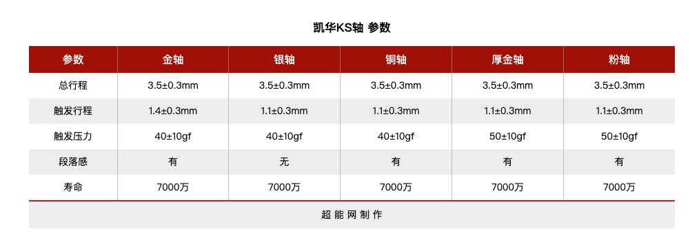 另外,在去年凱華還推出了中國風系列 BOX 軸,擁有黃、綠、紅、灰四種軸體,外觀上來看四種顏色都非常具有中國特色。在手感上除了灰軸由于 95gf 的觸發壓力顯得獨樹一幟以外,根據網友的描述,其他軸體基本是 BOX 茶、白和紅的優化版,手感非常優秀。但由于軸體比較小眾所以官方也未制作完整的參數表格。