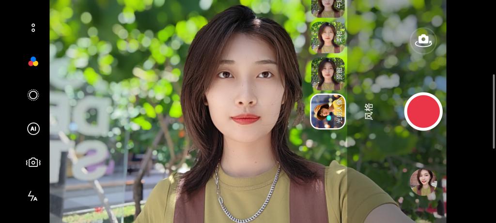 接下來是煥采光斑人像功能。這項功能支持視頻和人像自拍兩種拍攝模式,入口位于濾鏡選項中。它所能實現(xiàn)的效果大致可以拆分為兩個,其一是人像虛化,另外一個是背景光斑美化。從上圖可以清楚看到,經(jīng)過處理之后,樹葉不規(guī)則的反射光源均變成了虛化圓形,有種大片既視感。