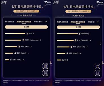 同時,從京東電腦數碼競速榜單中也可以看到,ROG、外星人以及微星的高端電競本位居排行榜前三。在高端輕薄本品牌銷量方面,Thinkpad、華為、微軟則位列前三名,各大廠商輪番在榜單上登場,頗有你方唱罷我登場的氣勢!不難發現的是,在品牌“你爭我搶”的局勢背后,也正是消費者對高品質生活的向往和追求。