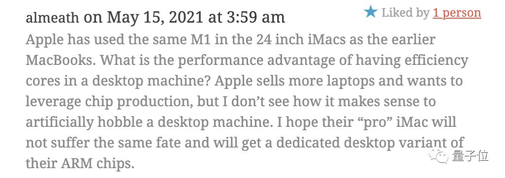 不過也有人不喜歡 M1 的這種機制,他認為在筆記本上這樣做可以延長續(xù)航。但臺式的 iMac 上真的要犧牲運行速度嗎?反正都是插電源的。