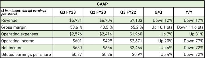 英偉達(dá)第三財(cái)季營(yíng)收為 59.31 億美元,同比下降 17%,環(huán)比下降 12%;凈利潤(rùn)為 6.80 億美元,同比下降 72%,環(huán)比增長(zhǎng) 4%,每股攤薄收益為 0.27 美元,凈利潤(rùn)為 14.56 億美元,同比下降 51%,環(huán)比增長(zhǎng) 13%。