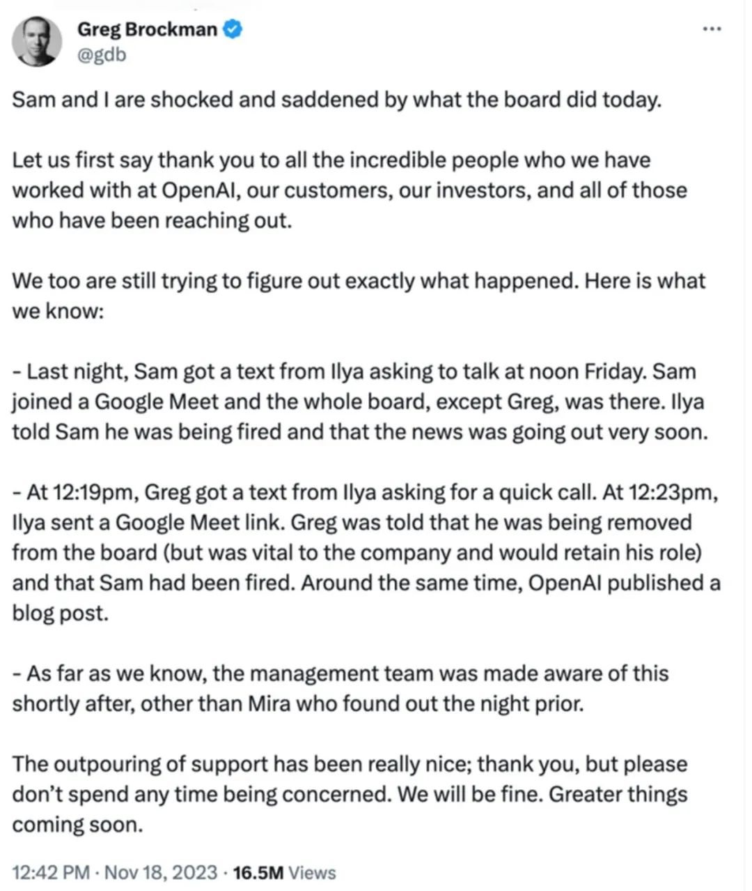 布羅克曼在推文中稱,“11月16日,奧特曼收到伊利亞發來的短信,要求17日中午談話,隨后在董事會會議上,伊利亞告訴奧特曼將被解雇,并且消息很快就會傳出;17日中午12點23分,伊利亞發送了一條 google Meet 鏈接,布羅克曼被告知,他將被從董事會中除名(但對公司至關重要,并將保留他的職位),而奧特曼已被解雇。大約在同一時間,OpenAI發表了一篇博文。據我們所知,管理團隊不久后就意識到了這一點,除了米拉在前一天晚上發現了這一點。”